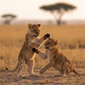 Watchful Guardian and Future King Under the golden sunlight of the African savanna, the moment when two lion cubs face each other appears like a...