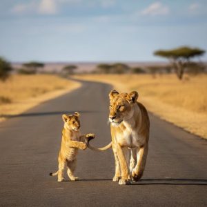 Innocence Meets Majesty THE ROAD OF LOVE – WHEN A LIONESS LEADS HER CUB INTO LIFE Across the vast African savanna, where the earth glows...