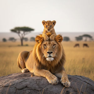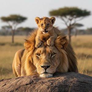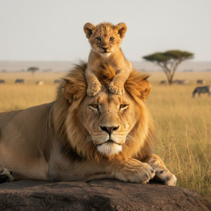 In that instant, one truth becomes clear: behind absolute strength lies a quiet tenderness. The same lion who commands silence across the plains allows himself to become a throne for his child. He does not growl. He does not shake the cub off. He simply remains still, patient, as if understanding that for his cub, this moment is everything.