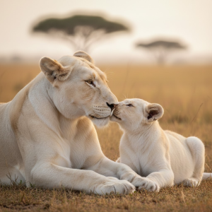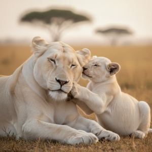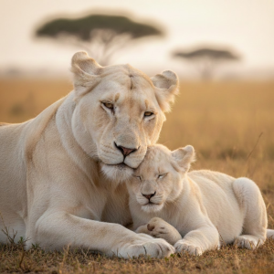 One of the most striking elements of this image is its emotional tone. The pale, almost white fur of both the lioness and her cub creates a sense of purity and softness. This gentle coloring contrasts sharply with the typical image of lions as fierce and dominant predators. Instead of intimidation, the photograph radiates calm and grace. This contrast invites reflection: true strength does not always roar. Sometimes, it exists quietly in the act of protecting another.