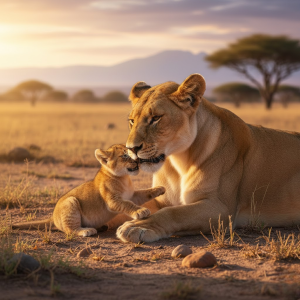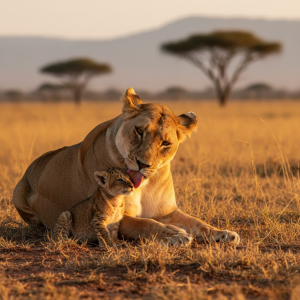 Under the vast sky of the African savanna, as the afternoon sun slowly descends and bathes the dry earth in warm golden light, a simple yet profoundly sacred moment unfolds. A mother lioness lies beside her small cub, gently licking the cub’s head with all the tenderness and love she possesses. In the heart of the wild—where life and death constantly walk side by side—this moment appears like a soft, warm melody, touching the deepest corners of the human heart.