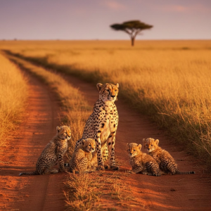 Ultimately, this cheetah family portrait is far more than a beautiful image. It is an invitation to reflect. It calls upon us to appreciate the natural world, to respect all forms of life, and to recognize our role in protecting wildlife and preserving fragile ecosystems. Beneath the golden sun of the savanna, on a quiet red-earth road beside a lone acacia tree, this cheetah family becomes a symbol of enduring life, sacred motherhood, and the timeless beauty that nature offers to those willing to truly see.