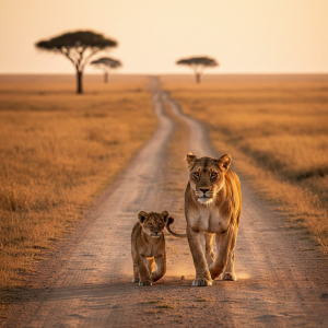 The lioness walks with calm assurance, her steps firm and measured against the warm asphalt beneath her paws. Her gaze is fixed aheadβalert, composed, and deeply experienced. Behind those steady eyes lies a lifetime of survival: hunting through hunger, guarding her pride against danger, enduring droughts and battles that shape the wild. She does not turn her head to check behind her. She does not need to. She knows her cub is there.