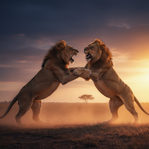 Two massive bodies explode upward from the ground, sending clouds of dust swirling violently into the air. Razor-sharp claws extend in challenge, and powerful jaws gape wide in thunderous roars that tear through the silence of the plains. In that frozen instant, it feels as though the entire savannah holds its breath, bearing witness to the confrontation of two kings. There is no mercy here, no room for weakness—only victory or defeat.