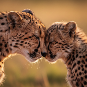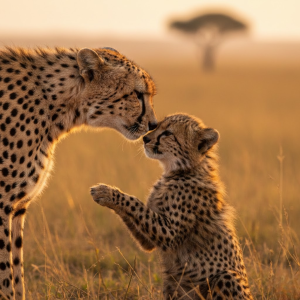 In the soft light of the golden hour, a mother cheetah lowers her head and touches noses with her cub. There is no urgency in the movement. No tension. No hunt in sight. Only love.