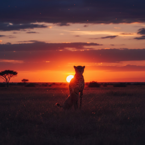 The mother stands tall and graceful, her lean body wrapped in a coat of golden fur patterned with dark rosettes that shimmer in the fading sunlight. Each mark on her body tells a story—of long chases across open plains, of hunger endured, of sleepless nights guarding her young from unseen dangers. Her eyes are trained to scan the horizon, to measure distance, to decide in fractions of a second. Yet now, those eyes soften. They slow. They hold nothing but devotion.