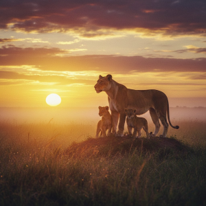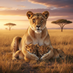 In the natural world, the role of the lioness is essential to the survival of the pride. She hunts, raises the young, teaches them the skills they will need, and cooperates with other lionesses to protect their shared domain. The two cubs in this image are not only her offspring but also the future of the pride itself. Every moment of protection today is an investment in tomorrow, ensuring that the cycle of life continues unbroken.